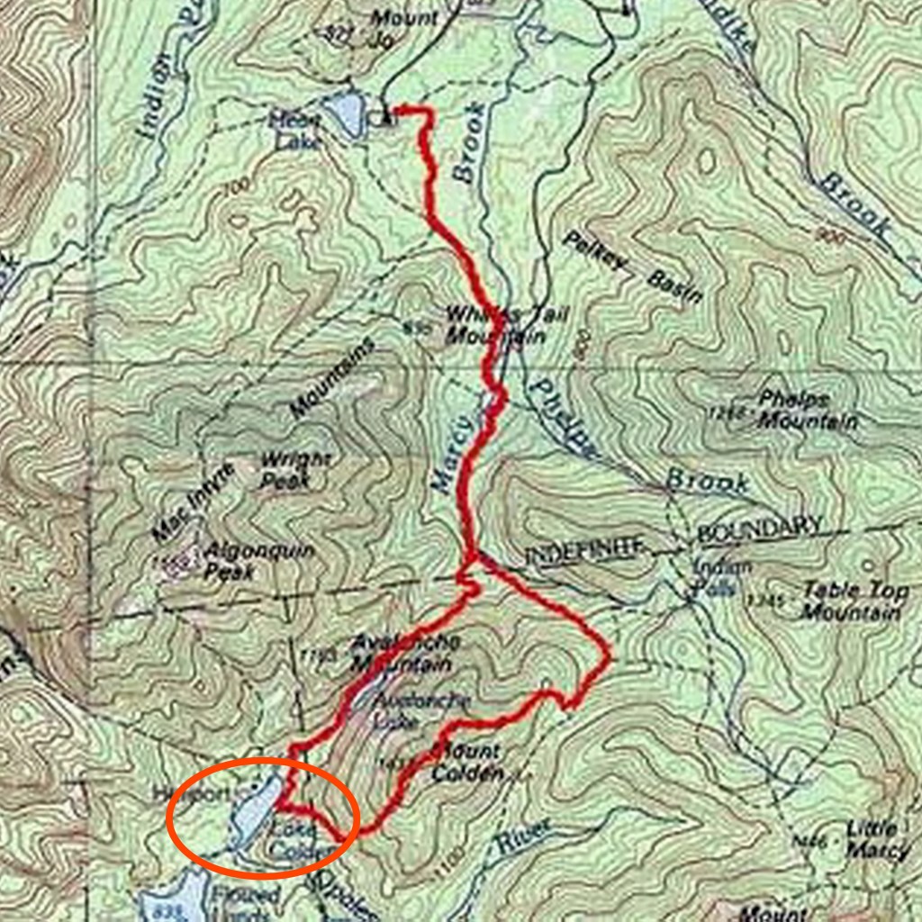 An early morning start. We followed the route to Lake Colden from the southwest. Starting from the Marcy Dam Lean-Tos, we head southwest through Avalanche Pass, past Avalanche Lake on the west shore, traversed the connection to and reached Lake Colden. We hiked the east shore of the Lake to the trail split – one trail going up Colden Mountain, the other to round the Lake.